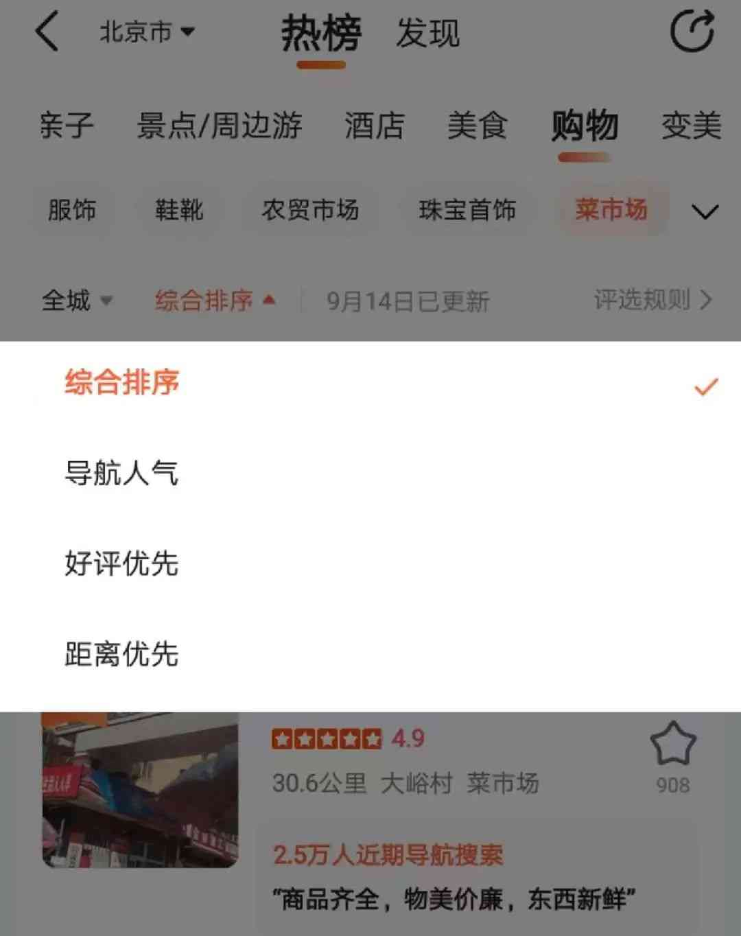 以上菜市场排名为“综合排序”名次。除此之外,还可按照“导航人气”、“好评优先”、“距离优先”排名,选择的标签不同,排名也会发生变化。