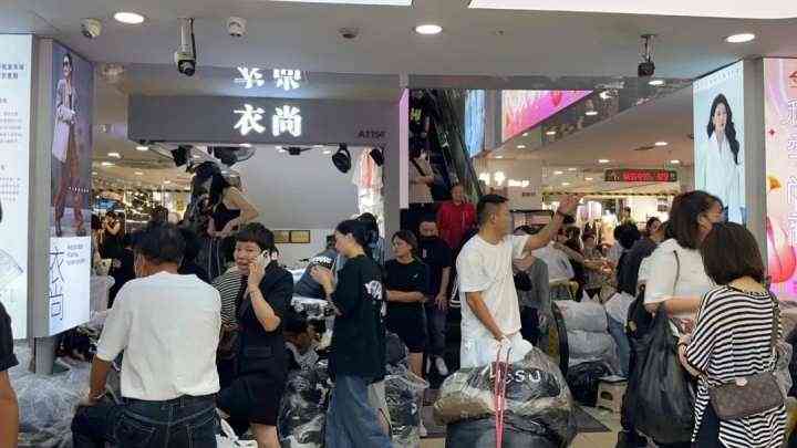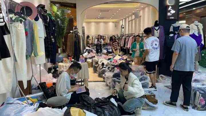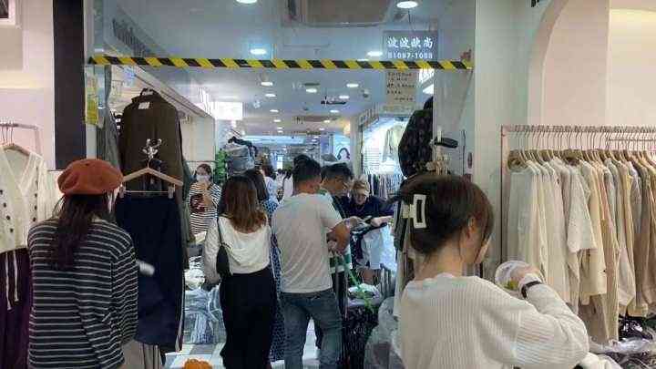 一街之隔的常青休闲女装服饰城,生意更是好得令人咂舌。记者甫一进门,里面挤满了人,就像是在赶庙会。眼前是人从众,每个档口都至少有两个模特站在高处不断试衣,店员们拿着手机边拍摄,边激情满满地做着介绍,采购的客人围拢在各个档口前,还有搬运人员匆忙穿梭在人流中,过道里满眼是黑压压的人头。