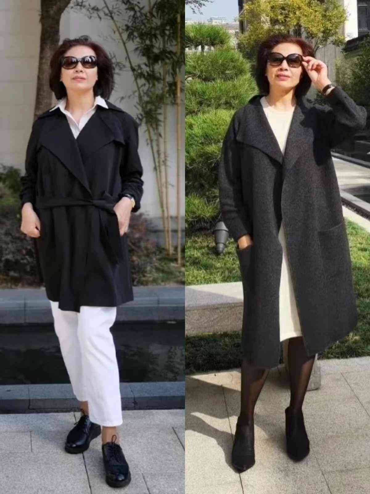 黑白配色非常经典,穿黑色大衣时搭配白色内搭、白色下装都能很好调节造型亮度。对于一些身材不完美的中老年人,还能打造窄长H型,显瘦显高。