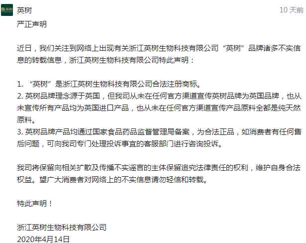 而针对上述内容,英树的3篇声明表示,“英树”品牌理念源于英国,但我司从未在任何官方渠道宣传英树品牌为国外(英国)品牌,从未宣传英树品牌创立于十九世纪初,也从未宣传所有产品均为英国进口产品,也从未在任何官方渠道宣传产品原料全都是纯天然原料,不存在误导消费者之说。“‘英树’是浙江英树生物科技有限公司合法注册商标。”这一句则被反复提及三次。