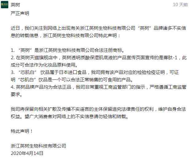 同时也称:“在英树天猫旗舰店中,英树透明质酸保湿肌底液的产品宣传页面宣传的是寡肽-1,此成分可合法作为化妆品原料使用。‘芯肌白’饮品属于日本进口食品,我司拥有该产品对应的检验检疫证明,可证明‘芯肌白’饮品是一个可以合法正常销售的可食用的产品。”