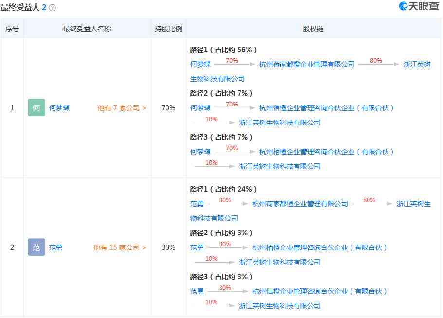 天眼查显示,英树成立于2015年11月9日,法定代表人范勇,注册资本为1000万。根据股东信息,杭州荷家都橙企业管理有限公司为大股东持股80%,杭州栢橙企业管理咨询合伙企业(有限合伙)和杭州信橙企业管理咨询合伙企业(有限合伙)分别持股10%。根据最终受益人,何梦蝶70%控股为英树实际控制人。