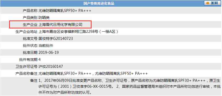另外,英树天猫旗舰店销售的英树UV尤维防晒隔离乳套用了“尤维防晒隔离乳”的特殊用途化妆品批文“国妆特字G20140723”。记者搜索国家药品监督管理局数据库发现,该产品的生产企业为上海雪代日用化学有限公司,并未显示英树任何公司信息。
