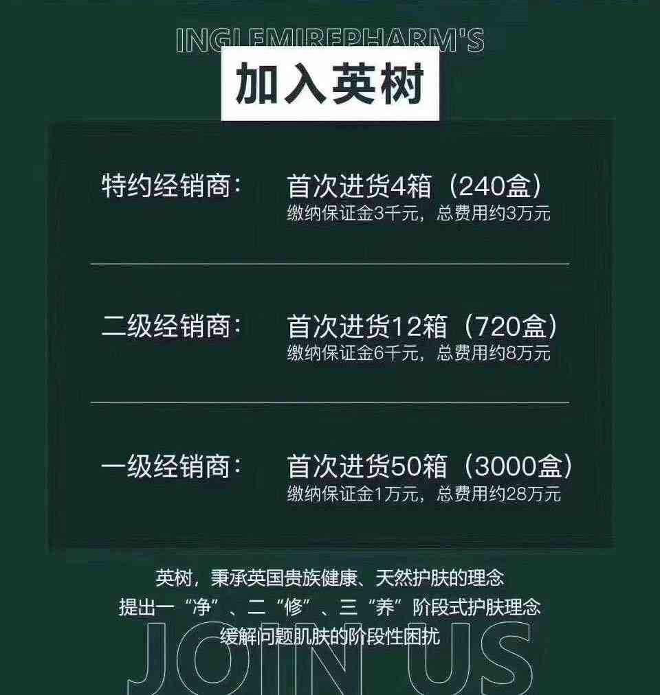 中国网财经记者辗转加到一位英树代理商,对方也很快提供了一份代理制度,内容包含了加入英树的三级经销商门槛。特约经销商,首次进货需4箱(240盒),缴纳保证金3千元,总费用约3万元。二级经销商,首次进货需12箱(720盒),缴纳保证金6千元,总费用约8万元。一级经销商,首次进货需50箱(3000盒)缴纳保证金1万元,总费用约28万元。