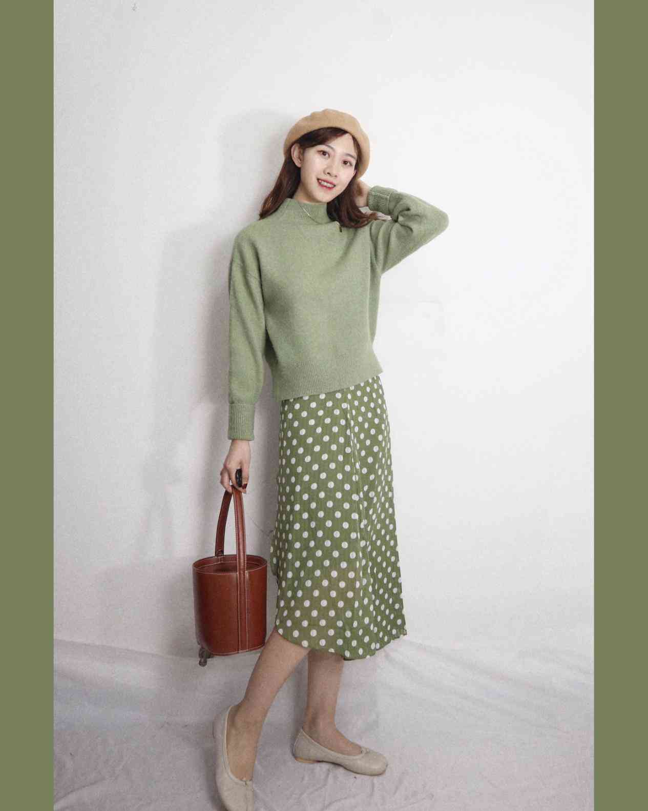 绿色的中领毛衣可以带来满目的生机和鲜活的气息,这种色彩很受年轻女生的喜爱,可以帮助她们穿出活泼的气质。它的版面不需要太过丰富,即使没有任何图案的添加,也能够美出干干净净的气质,这是很休闲随性的服装。下半身可以套上一款同样是绿色的波点半身裙,整体服装的色彩养眼又清新,稍微的露出小腿也不会觉得寒冷。