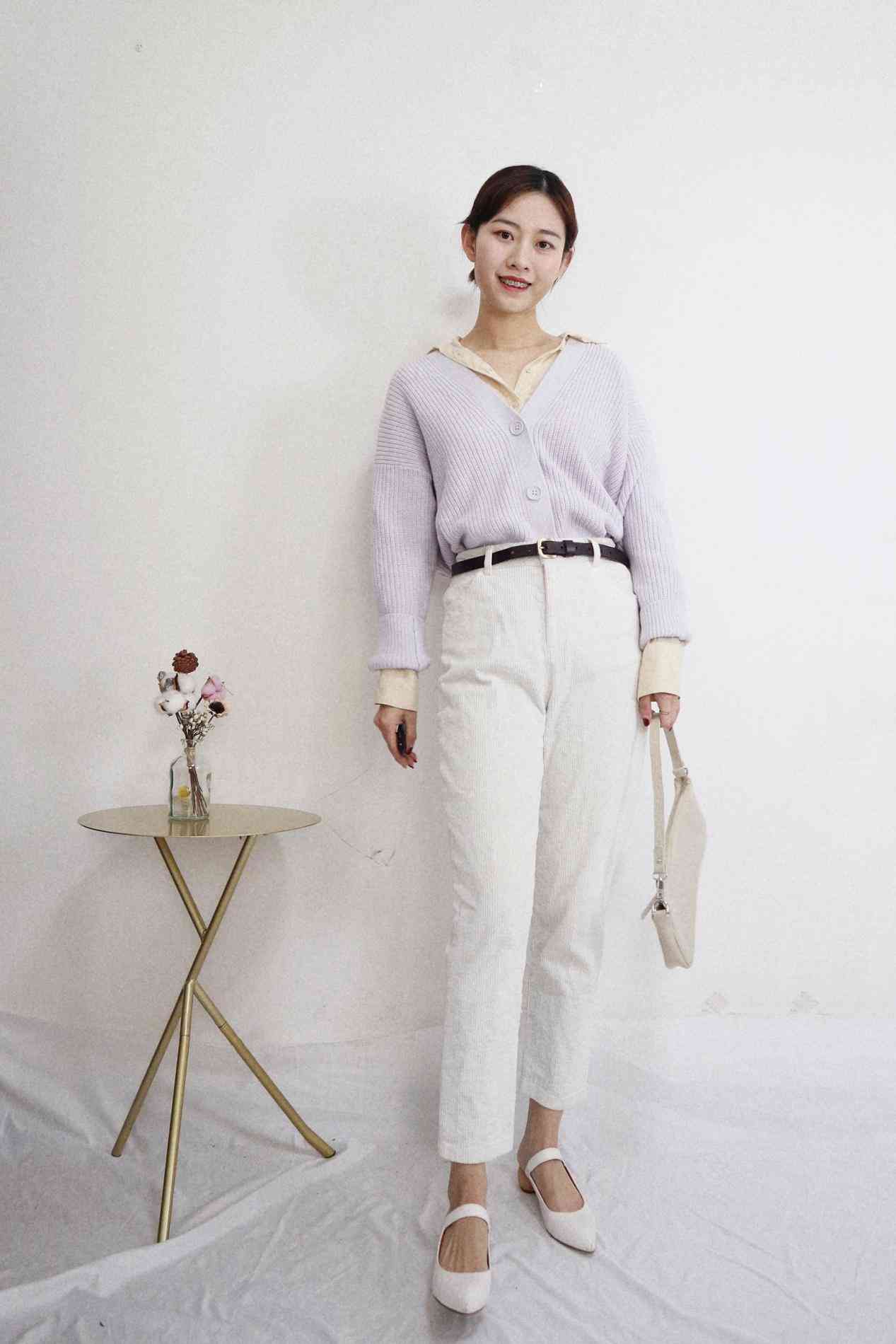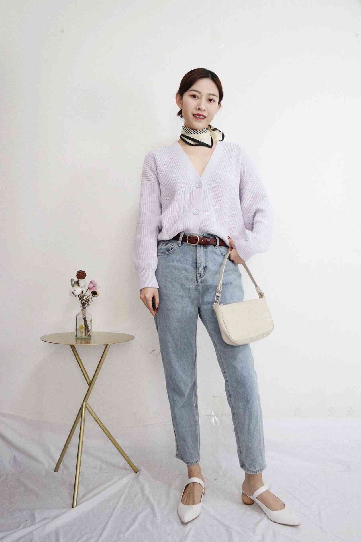 温柔女人就要用一些温柔的色彩装点,才能够散发出一股子柔情来。浅紫色的针织开衫很受优雅和温柔女人的喜爱,这种不明艳、不高调的色彩,穿在身上更容易展示出娴静的气息。还可以内搭一件米白色的休闲衬衫,它的领口会比针织开衫的领口高出一部分,由此呈现的层次会更加明显。