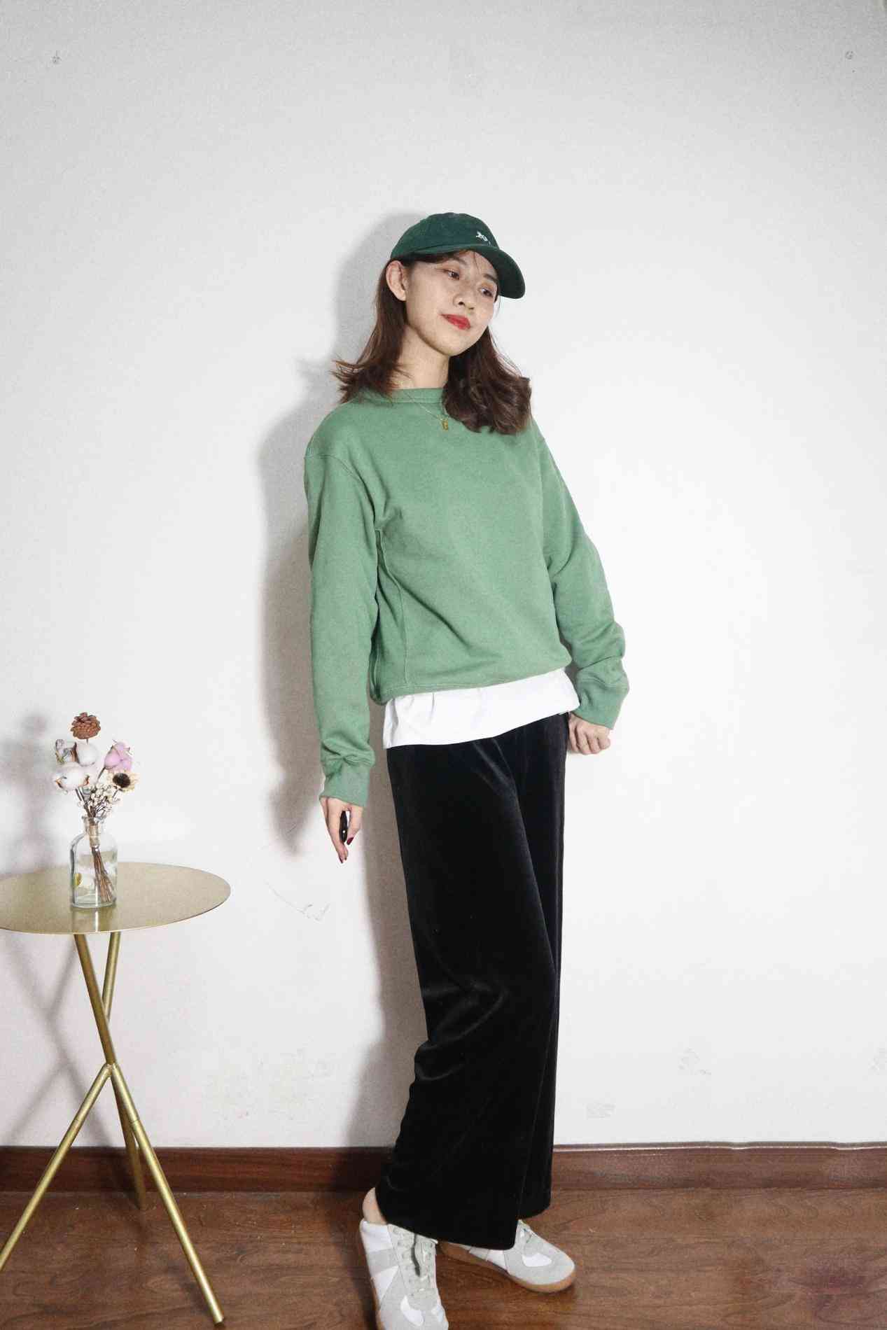 卫衣能够塑造出一套日常的穿搭,它的版型大多都是宽松的类型,但也不能过于宽大,只需要比自己的身材大出一个或两个尺寸即可。选择绿色的圆领卫衣时,还可以在里面穿上一款白色的T恤,将它的下摆拉出来,就能够让上半身多一个层次,整体的色彩也能够搭配和谐,下半身可以穿上灯芯绒材质的黑色阔腿裤,就可以带来一组休闲又随性的造型。