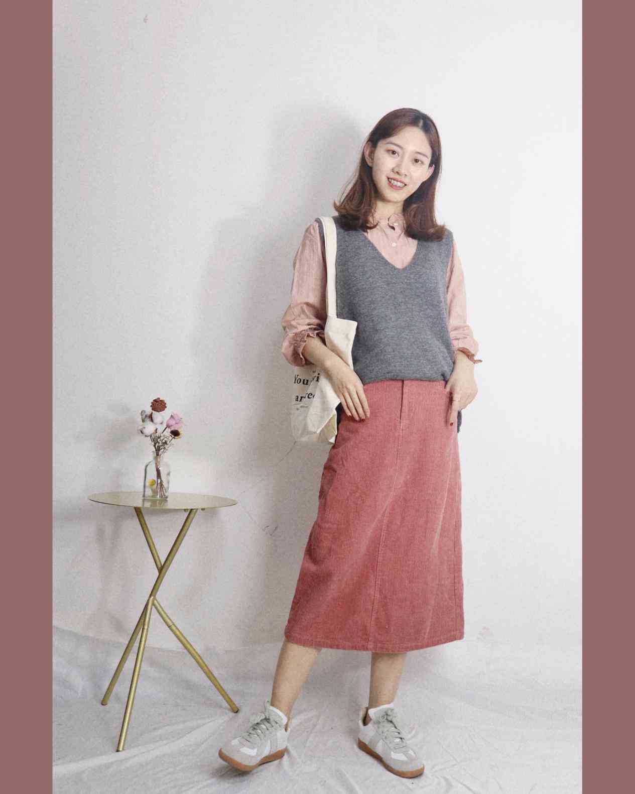 粉色的衬衫也有多种搭配方式,除了能够单穿以外,也可以搭配各种色彩的毛衣马甲。不知道选什么颜色才能够搭配和谐,可以尽量以一些低调的色系加身,比如浅灰色的毛衣马甲就是一款“不作妖”的颜色。下半身再套上一条桃红色的半身裙,它可以和上半身的粉色衬衫形成一种色彩上的过度。
