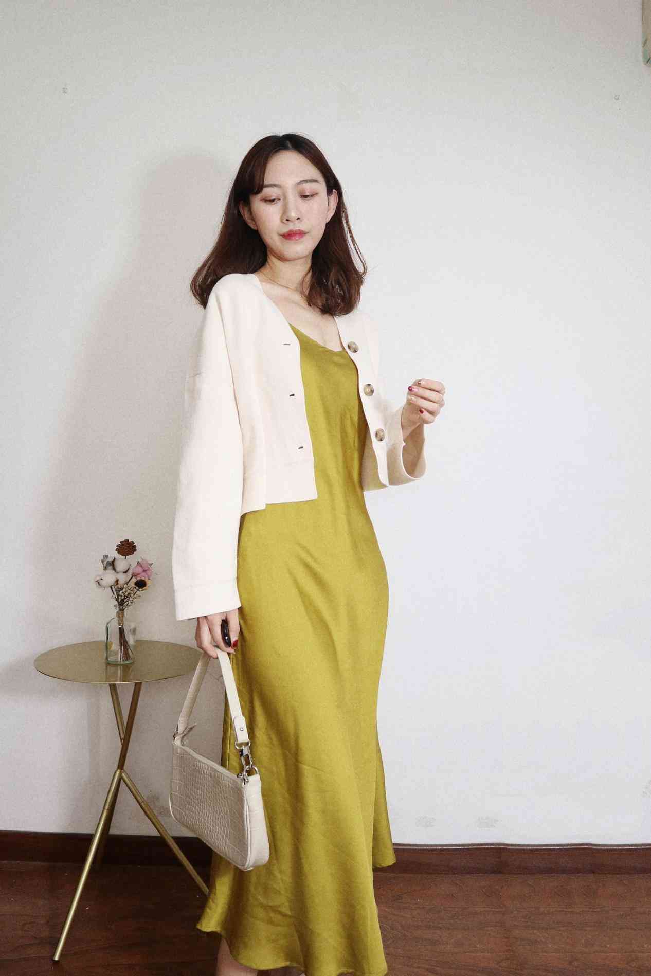 偶尔在日常穿搭中注入一丝妩媚的气息,也能够让女生的衣品开挂,颠覆一下以往随意的形象,看起来更有魅力。白色的针织开衫可以和各种连衣裙搭配在一起,塑造出更浓的女人味,内搭一件绿黄色的吊带绸质长裙,它能够突出女生的腰臀比,打造出一个流畅又饱满的曲线。