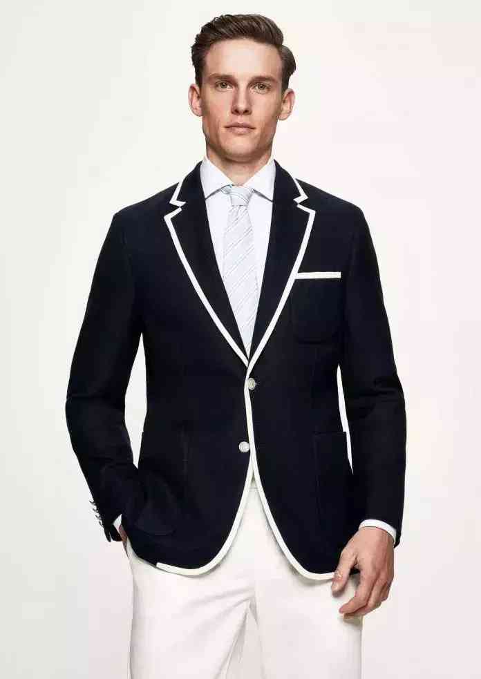 例如下面这款西装外套这是亨利皇家帆船赛系列的单品之一,绅雅的西装有着现代元素的活跃体现,最吸引我注意的是西装的对比色管状细节和徽标雕刻金属纽扣增添了恰到好处的精致点睛之笔,带着一丝航海风味,符合系列主题的同时也不失美感。