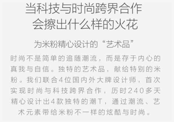 近日,小米众筹就上架了这样一套T恤,名为“COTTONSMITH设计师联名合作款T恤”,联合4位国内外大牌设计师,首次实现时尚与科技跨界合作,历时240多天精心设计出4款独特的潮T恤,号称为米粉精心设计的“艺术品”。