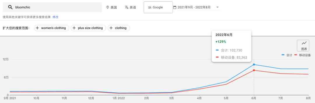 以bloomchic.com为例,该域名就包含了品牌名,并且根据谷歌趋势,可以发现“bloomchic”的搜索趋势不断上涨,通过品牌词流量可以侧面反映品牌的声量在不断提高。