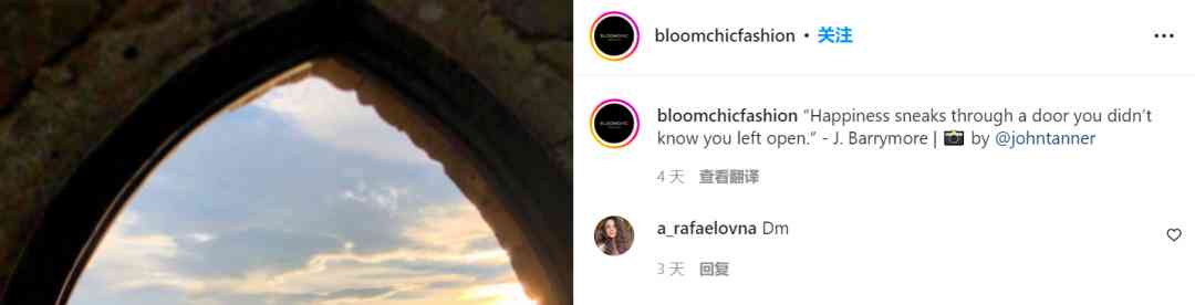 Instagram的关注者为39.8万,Instagram作为女性服装品牌的主要战地,内容除了产品更新外增多了分享红人/买家秀,抓住了竖版短视频的热潮(Instagram-reels),但缺乏与品牌价值观/女性力量相关的内容。BloomChic在Instagram主页进行了快拍精选集的运营,能够让到访主页的用户在短时间内就看到品牌想要呈现给消费者看到的内容,但有部分精选集运营频率较低。建议固定品牌专属的hashtag,类似chicme有#chicmebabe,虽然部分内容带有#Bloomchic、#bloomboldly、#bloom 10to30,但不是所有内容均有标注,目前与#Bloomchic相关的帖文内容较少。