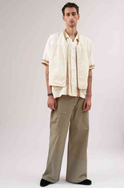 设计师Jan- Jan本人是一位来自安特卫普的品茶绅士。他把神奇的、充满感情的面料折叠到衬衫、裤子或类似和服的夹克中,尽可能减少接缝和剪裁。