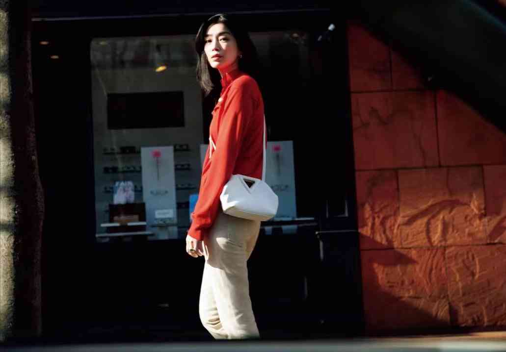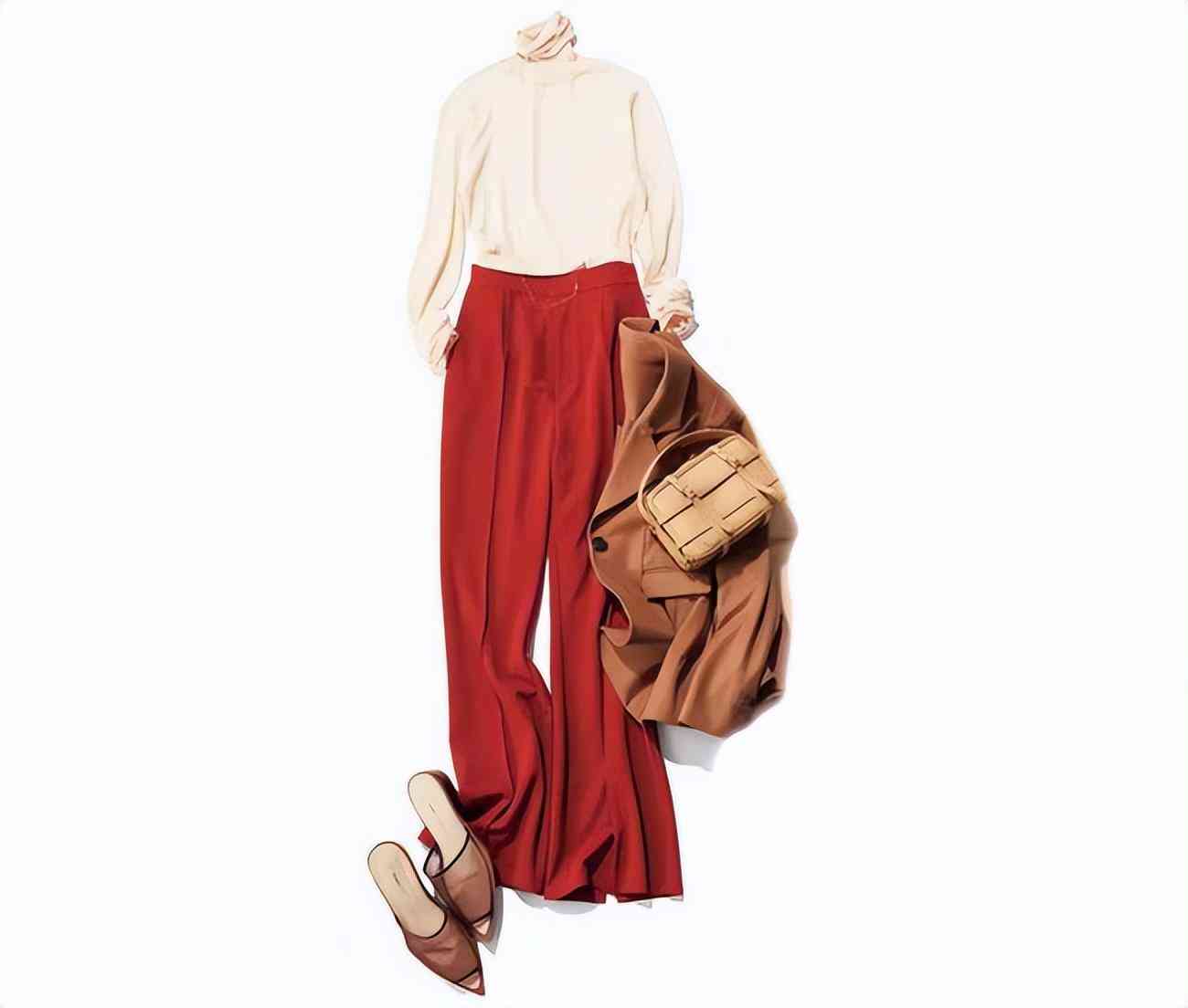 看看,米色针织衫、尖头凉鞋的介入,让红色长裤的穿搭一下妩媚起来。外面搭配一件棕色西服,吟唱着米、红、棕的张扬大戏。