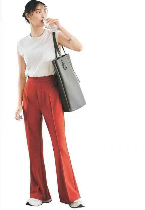 搭配红色直筒裤,微喇放摆的裤长全是柔和曲线带来的女性氛围。休闲老爹鞋有模有样地探头露面,拿捏着潮酷分寸。