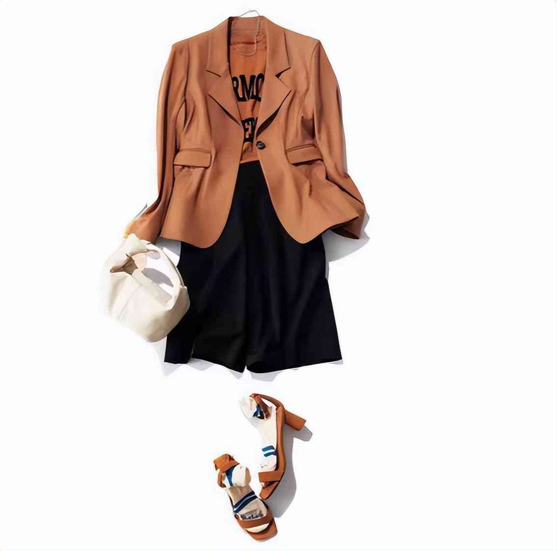 换成棕色T恤与西装,再来一双棕色高跟凉鞋点缀,就是黑色中裤常见的通勤行头。与众不同的是,借用自上而下的棕色呼应,尝试着高级感的蜕变。