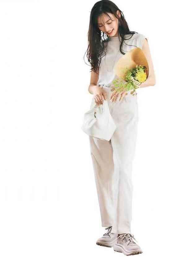 而米白色,又凭借着一点暖意与耐脏格外受欢迎。搭配米白色无袖T恤,恰好凑成同色系,用休闲鞋点缀,混搭得一气呵成。