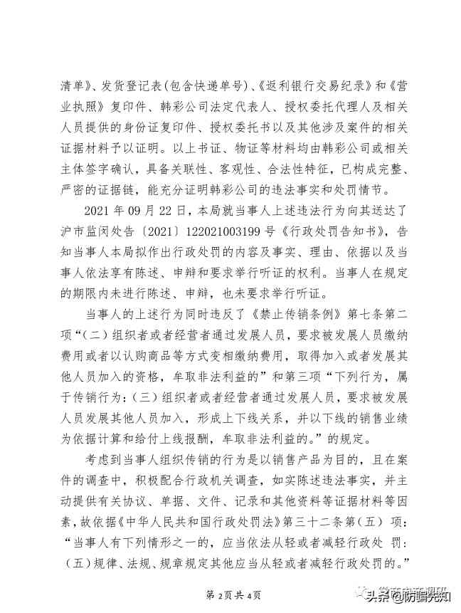 公布的行政处罚书上,显示处罚主体是上海韩彩贸易有限公司,法定代表人YANGJANGSUK(梁将锡),经查,这个公司的品牌就是伊蓓诺。处罚书载明,由对韩彩公司授权委托人蔡诚、财务刘洁、物流经理万红波和相关人员制作的询问笔录、韩彩公司提供的《办公室租赁合同》、《情况说明》、公司人员名单、产品外观照片打印件、《支援金政策、工资政策》、《各级人员发展结构图》、《订单商品详细表》和货款银行明细、《团队支援金工资结算表》、《产品销售第 2页共 4页清单》、发货登记表(包含快递单号)、《返利银行交易纪录》和《营业执照》复印件、韩彩公司法定代表人、授权委托代理人及相关人员提供的身份证复印件、授权委托书以及其他涉及案件的相关证据材料予以证明。