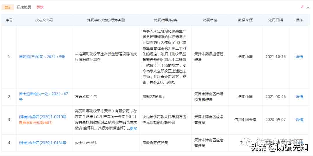 今年10月16日,高丽雅娜化妆品公司因为未定期对化妆品生产质量管理规范的执行情况进行自查,违反了《化妆品监督管理条例》第三十四条的规定,依据《化妆品监督管理条例》第六十二条.款第(三)项的规定,责令立即改正违法行为,并决定处罚2万元罚款。今年8月26日因为发布虚假广告,被天津市津南区市场监督管理局罚款2756元。去年还因为安全生产违法,被罚款85000元。