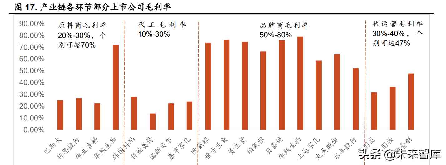 我们从各环节选取一些具有代表性的上市公司,来探究各环节的盈利能 力。毛利率方面,上游原料商的毛利率水平一般为 20%-30%,美妆代工厂的 毛利率为 10%-30%。个别原料提供商如透明质酸龙头华熙生物的原料产品 业务毛利率可达 70%。中游品牌商的毛利率最高,区间在 50%-80%。其中, 国际大牌和国产功能性护肤品牌毛利率在 70%-80%,传统国货品牌的毛利 率大多在 60%-70%,水羊股份毛利率在 50%左右,主要由于其贴片面膜品 类毛利率较低,新锐品牌尚处于培育期,且增加了品牌代理业务。下游代运 营商的毛利率为 30%-40%,个别企业如壹网壹创毛利率可达 47%,主要由 于其业务结构中高毛利率的品牌线上管理服务(服务费模式,不买断产品)占比较高,低毛利率的买断模式(经销模式)占比较低。另外,根据艾瑞咨 询的信息,下游经销商的毛利率为 20%-40%,零售终端的毛利率为 30%-40%。