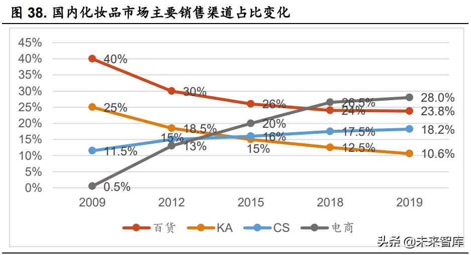 我国化妆品市场经历了几轮渠道更迭,大致可分为以下几个阶段: (1)百货及 KA 时代(2000-2009 年):KA 渠道指沃尔玛、大润发等大 型商超,产品主要覆盖日化用品及大众美妆产品。百货渠道品牌档次高于 KA, 注重消费者体验,是海外大牌在国内的线下主战场。 (2)CS 渠道红利(2009-2015 年):CS 为屈臣氏、丝芙兰、娇兰佳人 等化妆品专营店,通常为多品牌加盟代理经营。通过布局下沉市场,自然堂、 珀莱雅、韩束、百雀羚等本土品牌随着 CS 渠道的发展而快速崛起。 (3)传统电商红利(2015-2018 年):电商渠道增长迅速并成为.大 渠道,淘宝、天猫等等传统电商平台兴起。线上渠道进入壁垒低,面膜、精 油等品类与电商渠道契合度高,孵化出了阿芙精油、御泥坊、膜法世家等受 益于电商红利的“淘品牌”。珀莱雅在该阶段也积极抓住线上化趋势进行布局, 销售额实现快速增长。 (4)社交电商红利(2018 年至今):社交电商兴起,出现了完美日记、 花西子、橘朵等新锐品牌。