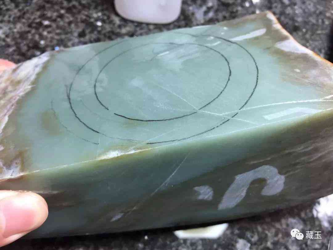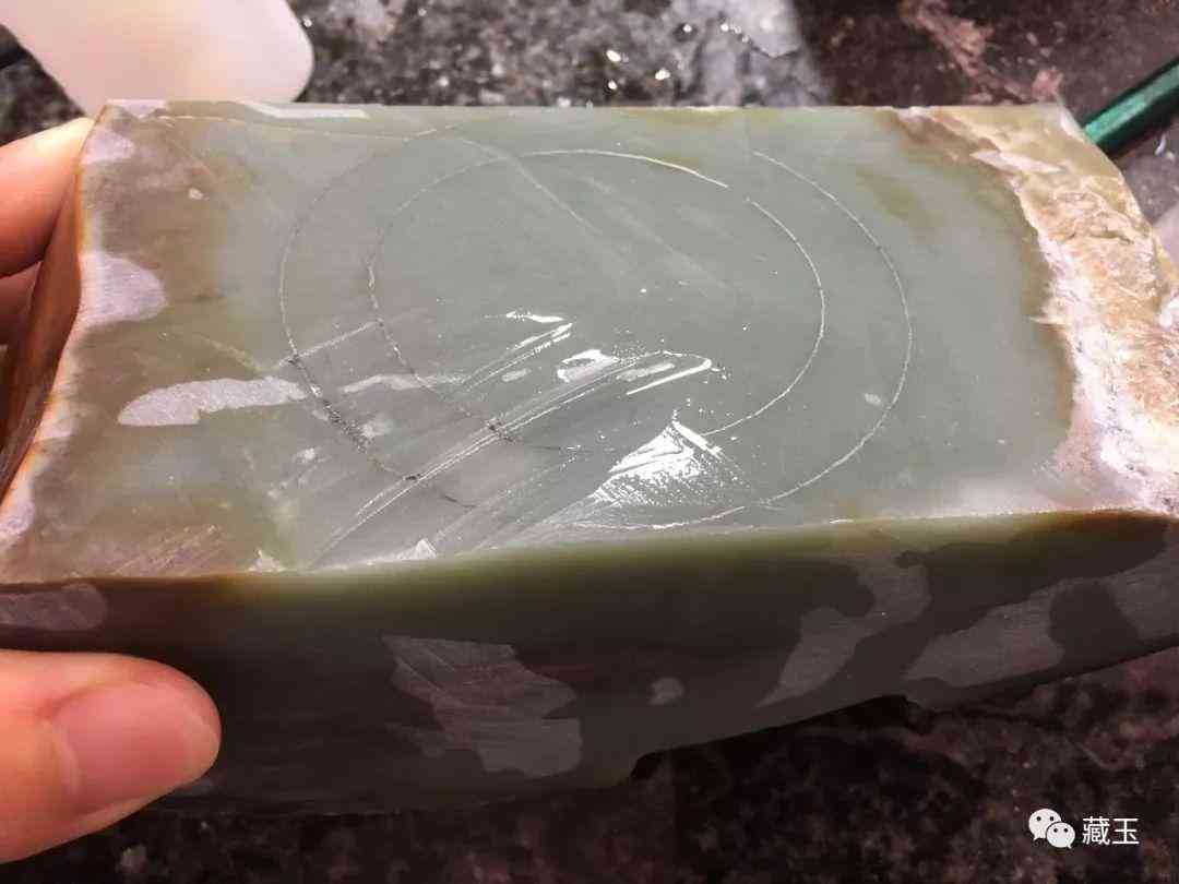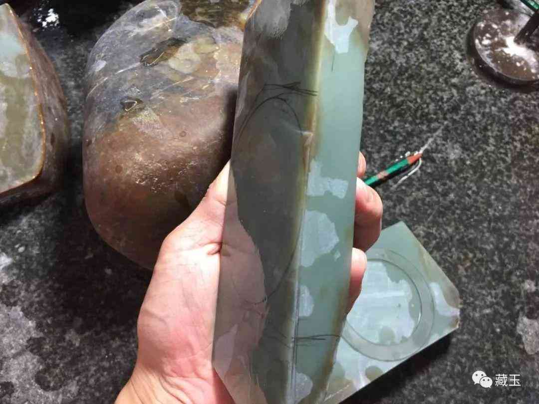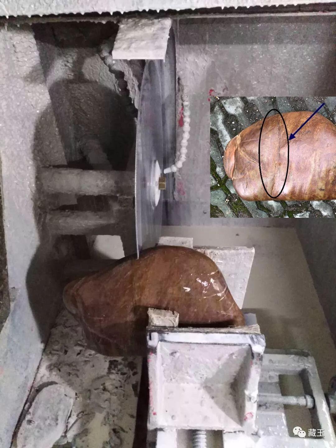 从图上可以看出,这块料子虽然厚,但是下半部分窜糖严重,且有裂,所以只能从中间切开,只留上面这一片玉肉相对干净的部分。