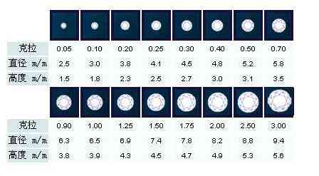 标准切割的钻石,有对应的钻石大小与尺寸标准,以标准明亮式圆形切割钻石为例,下图: