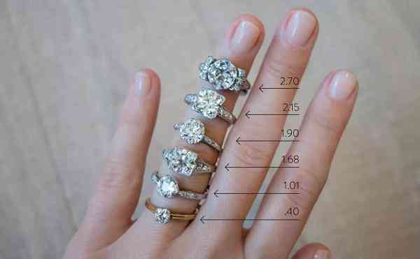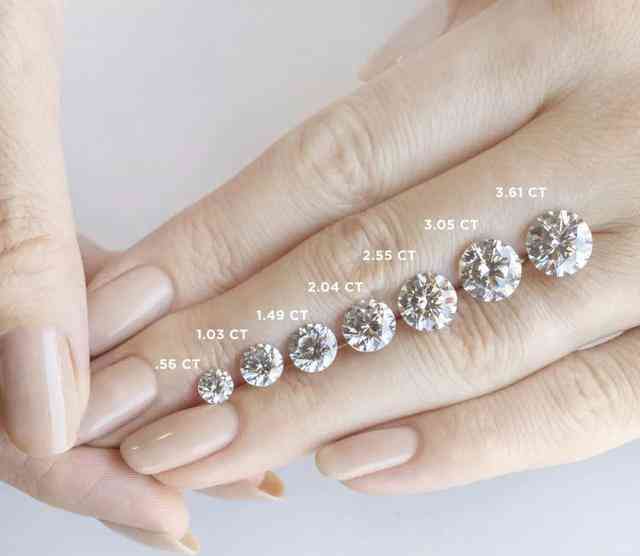 以标准切割为前提,钻石重量越大,尺寸越大。不同大小的钻石佩戴效果有些区别。受物体之间的对比效果,手指尺寸越小,佩戴的钻石会看起来越大。手指越粗,钻石看起来会越小。