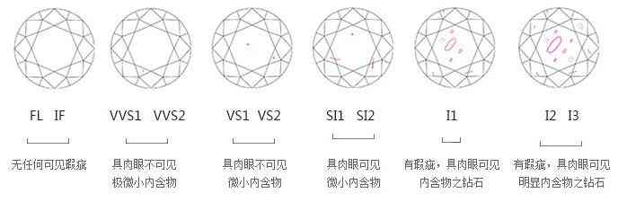 GIA将钻石净度级别分为:FL、IF、VVS1、VVS2、VS1、VS2、SI1、SI2、P1、P2、P3十一个小级别。