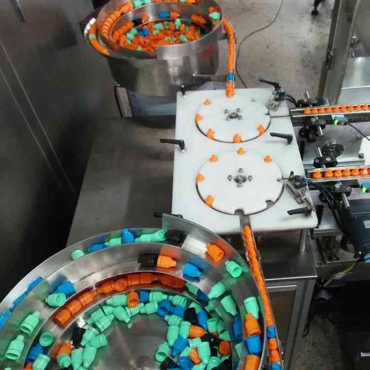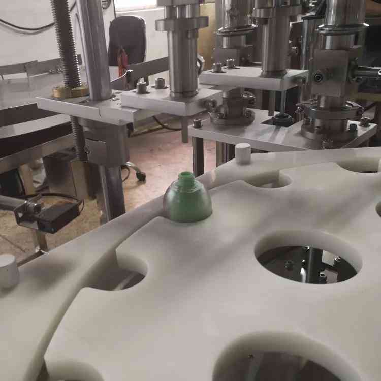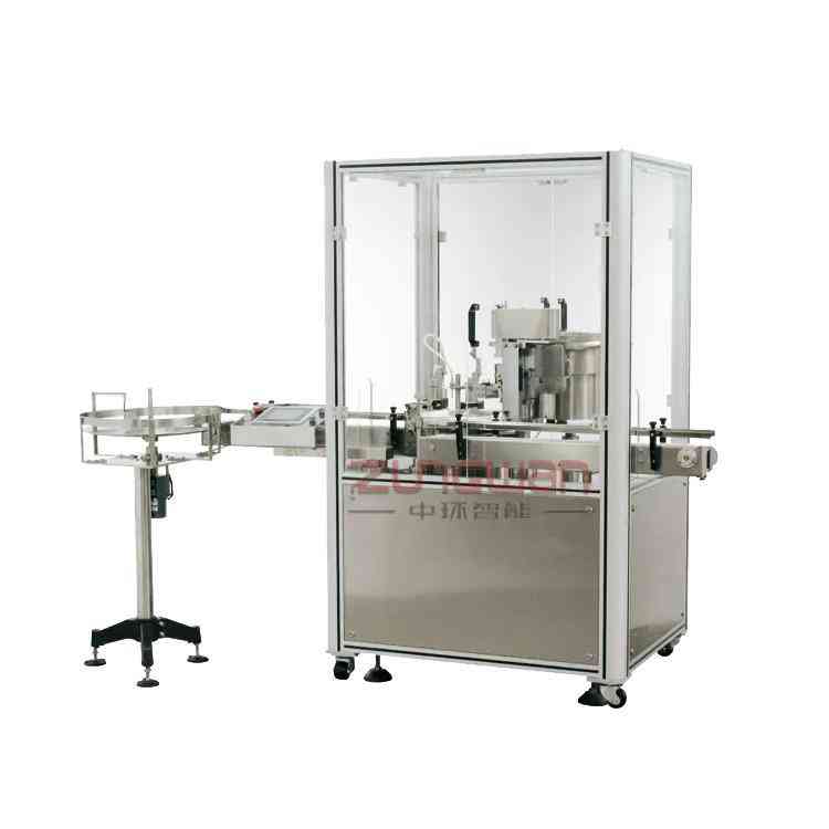 ZHJY-50全自动护肤品乳液灌装机旋盖机属于转盘式灌装旋盖设备,人工上瓶后,输送带把瓶子送进转盘机构内,进行瓶检测,瓶子进来就灌装,瓶没进来就不灌装,检测到有瓶子就下盖子,自动旋盖。灌装量精确度高,旋盖稳定。