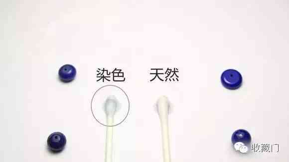 最常用有效的鉴别方法就是用酒精或酸性物质接触青金石,染色青金石遇酸或酒精会迅速掉色。这里我们推荐使用高浓度医用酒精。具体方法:用棉签取适量酒精,多次重复擦拭青金石表面约半分钟左右,如果棉签上出现蓝色的为染色青金石,无色的为天然青金石▼