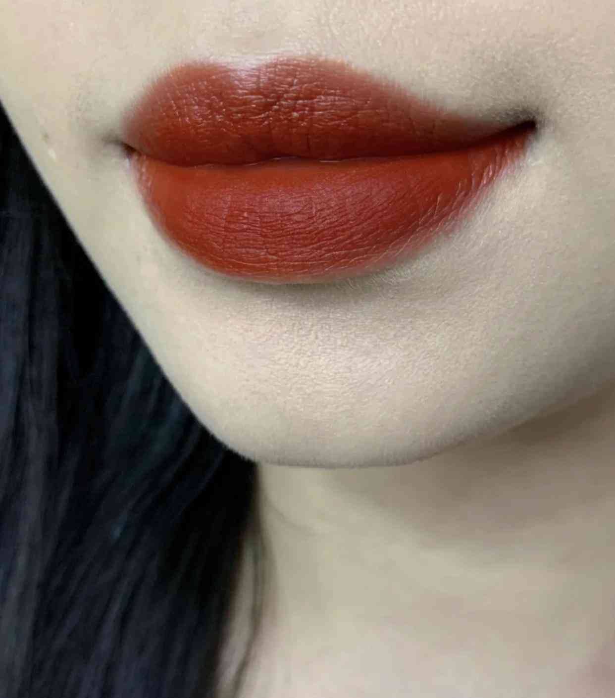 这款颜色特别的显白,黄黑皮放心入手,不会踩雷,更妙的是它的质地轻薄,哑光质地,涂在嘴巴上,不粘嘴,轻微染色,但是很容易卸掉。薄涂厚涂都很好看,薄涂橘色调比较明显一点,很提升气色,如果厚涂的话,里面红色调更显眼一点,是一款显得唇红齿白的颜色。
