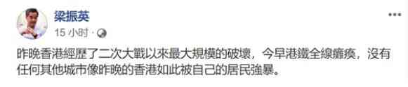 香港警方5日凌晨表示,严重暴力行为在短时间内迅速蔓延到全港14个区。一些商店被严重破坏,货物散落一地。有暴徒如劫匪一般撬开银行闸门,在里面纵火。更有大批暴徒围攻一名便衣警察,该警员因自卫而开了一枪,期间暴徒甚至试图抢枪。“昨晚香港经历了二次大战以来最大规模的破坏,今早港铁全线瘫痪,没有任何其他城市像昨晚的香港如此被自己的居民强暴。”香港前特首梁振英5日这样在社交账号上发帖感叹道。