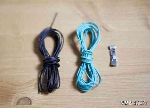 两根红绳手链编法第1步:准备两种颜色的绳子、金属扣子。