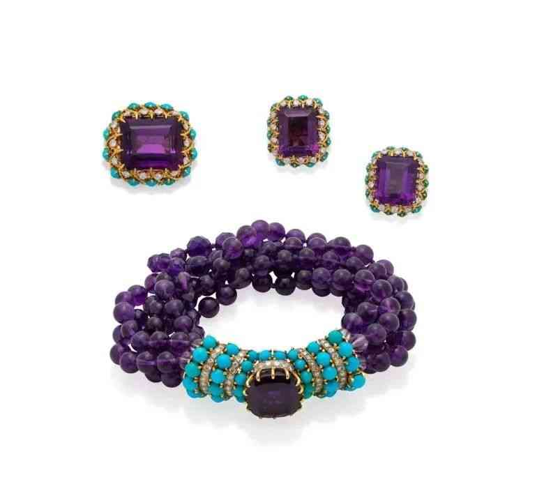 紫水晶、绿松石及钻石手链、耳环和戒指套装 (日内瓦拍卖,2020年) 成交价:40,000瑞士法郎