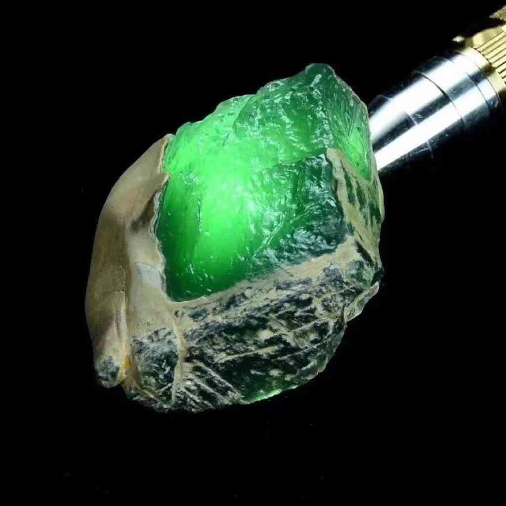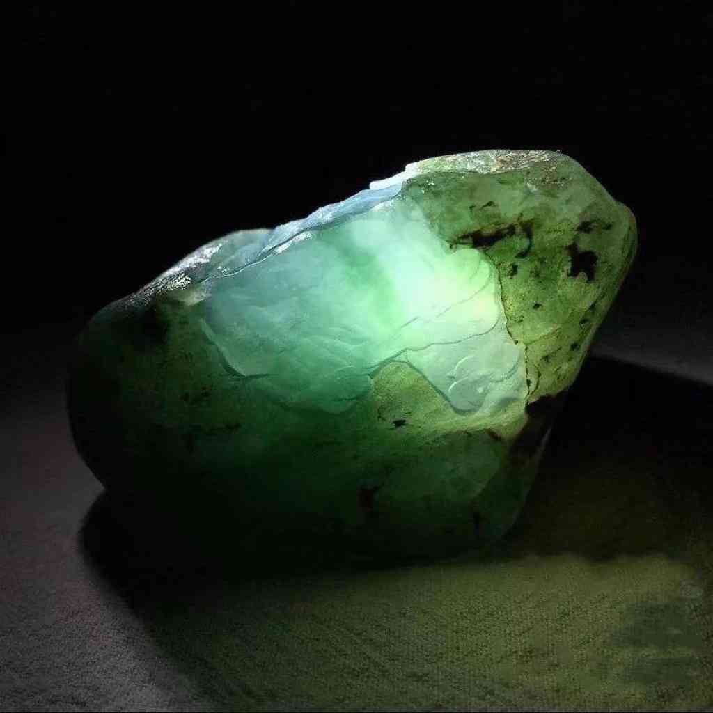 如果是被强酸浸泡过的翡翠原石,那么内部晶体之间就会形成裂缝,会有一种溶蚀感。这时候用强光照射,会有一种棉絮一样的效果,还有错综复杂的裂缝。