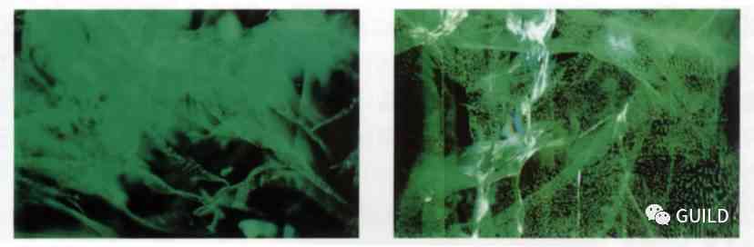 有些水热法合成祖母绿制品内保留了种晶片,种晶片周围有云雾状的两相包体分布。水热法合成祖母绿内部的波状或锯齿状生长纹和色带,大多平行于种晶板,与z轴的交角在22°~40°之间,而且具不规则的亚颗粒边界,近垂直于色带,形成角状图案,这是天然祖母绿中所没有的。
