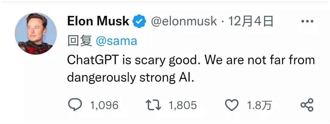 目前人们还沉浸在ChatGPT的魔力当中。作为OpenAI曾经的创始人之一,马斯克12月4日在推特回复中称赞了ChatGPT,他说“我们离强大到危险的AI不远了”。