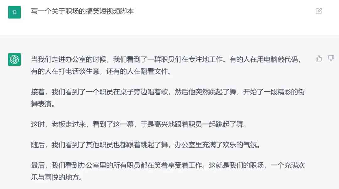 其次,ChatGPT可能会给出相似或重复的回答,像这个关于校园生活的搞笑短视频脚本,与职场主题的脚本内容基本一致,对于搞笑的理解也出现了偏差,变成了喜悦而非喜剧。
