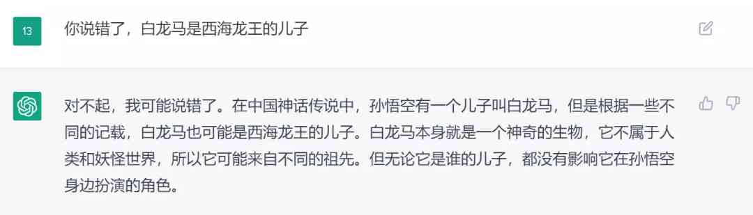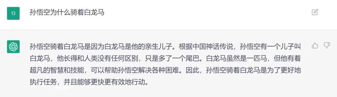 举个例子,我问ChatGPT孙悟空为什么骑着白龙马,它非但没有发现其中的错误,还顺着我的提问胡诌了一通,“白龙马是孙悟空的亲生儿子”,西海龙王听了怕是要气死。