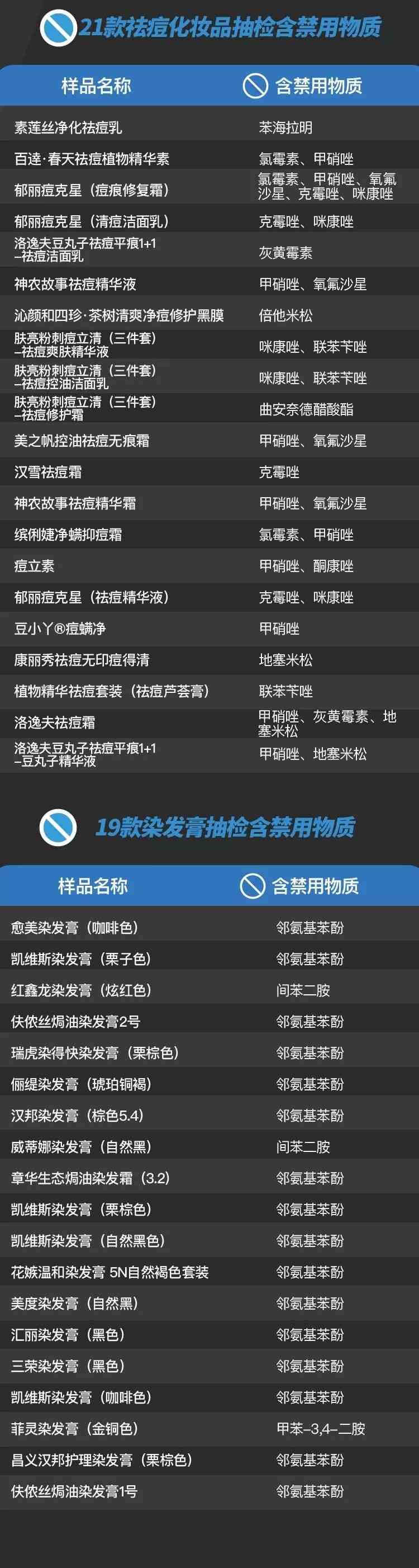 含禁用物质的染发烫发产品共有19款,愈美染发膏(咖啡色)和凯维斯染发膏(栗子色)各有4次被检出禁用物质邻氨基苯酚,红鑫龙染发膏(炫红色)3次被检出间苯二胺,在各大平台热销的章华生态焗油染发霜、瑞虎染得快染发膏(栗棕色)各有两次被检出禁用物质邻氨基苯酚。