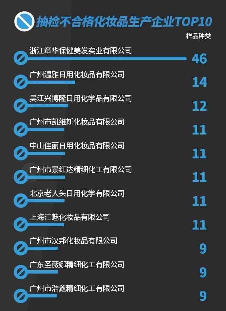 有关大数据研究院统计发现,这1600多批次不合格化妆品标称来自400多家生产企业,其中标称“浙江章华保健美发实业有限公司”的不合格化妆品种类多,有40多款。此外,“广州温雅日用化妆品有限公司”有14款产品,“吴江兴博隆日用化学品有限公司”有12款产品上榜。