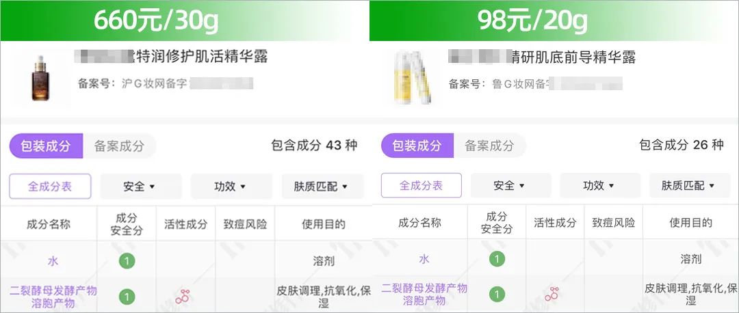 而二裂酵母发酵产物滤液、二裂酵母发酵产物提取物(后文简称“滤液”、“提取物”),更像是过滤/提取的残渣水,活性成分含量相对低,功效多以保湿为主。