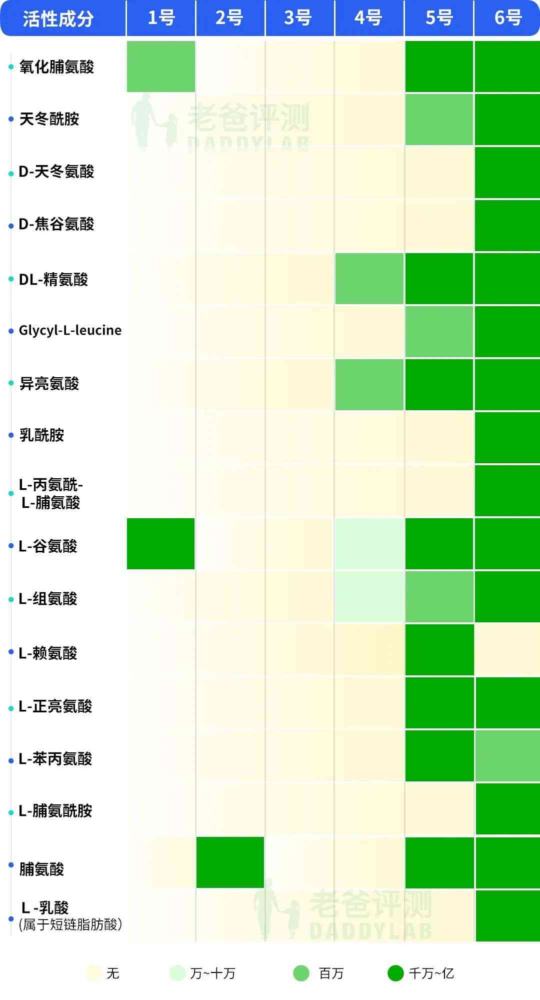 实验员总结发现,本次测试,6 款原料的活性物差异主要体现在氨基酸种类及含量。