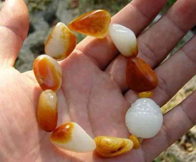 玉石山料风化崩落,经大气、流水选择风化、冲刷、剥蚀、经流水分选沉积下来的优质部分,一般呈卵状,大小全有,但小块多,大块少;并且具备一定的特色,比如皮色特别象形的,特别稀少的皮色、颜色的,比如料的形状是很舒服的,比如料的肉质是超级的,如果没有特别的.优点一般是不能称为玩料,修过的料,磨过的料不管多好,已经不是原籽了,因此就不归类到玩料之中了。