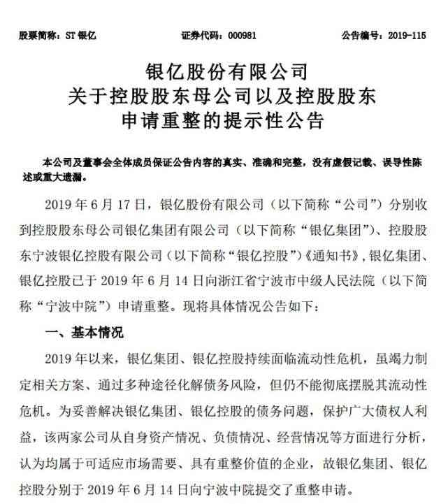 6月17日中午,上市公司ST银亿发了公告,银亿集团、银亿控股已于2019年6月14日向浙江省宁波市中级人民法院申请重整。