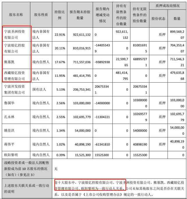先来看看ST银亿的前十大股东,里面的前四大,分别是,宁波银亿控股有限公司、宁波圣洲投资有限公司、熊基凯(熊老板儿子)、西藏银亿投资管理有限公司为一致行动人关系。