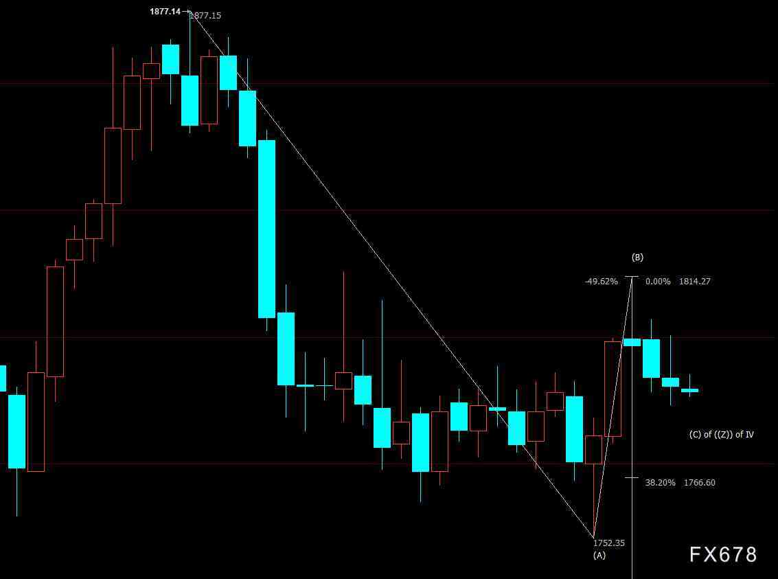 技术面来看,金价自1814美元开启下行(C)浪走势,下方支撑看向38.2%目标位1752美元。(C)浪是自1877美元开启的下行((Z))浪的子浪,((Z))浪则隶属于自2075美元开启的调整IV浪。