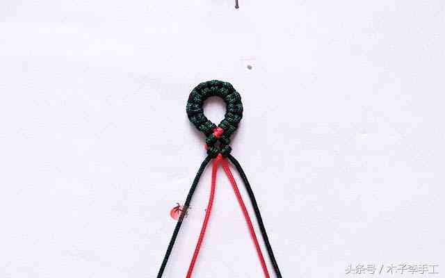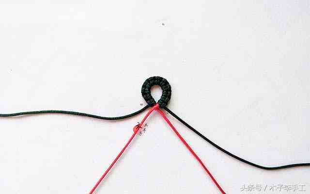 1、取一根红色线对折,用绿色线在对折处做雀头结,做2厘米左右